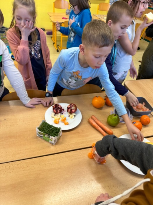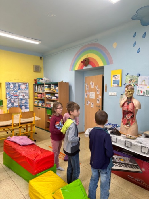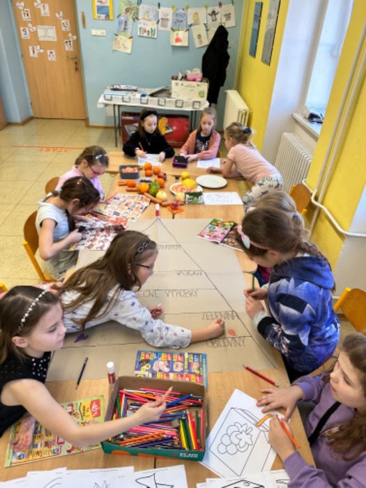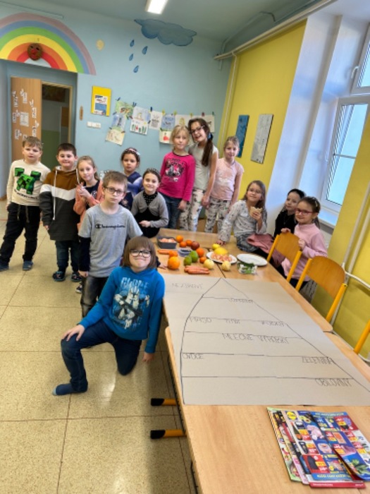 V měsíci únoru jsme se s dětmi ve školní družině bavili na téma ,,Lidské tělo, zdravá a nezdravá výživa“. Malovali jsme zdravé a nezdravé potraviny, vystřihovali a lepili obrázky z časopisů. Cílem bylo, vytvořit potravinovou pyramidu. Také jsme si udělali ochutnávku ovoce a zeleniny. Děti některé potraviny poznávaly pouze pomocí svých smyslů. Také jsme obkreslovali postavy, malovaly obličeje a orgány v těle. Shlédli jsme krátký film o lidském těle, zahráli hry a tím ukončili tento projekt. Cílem projektu bylo to, aby si děti uvědomily, že zdraví pro nás není samozřejmost a musíme se o něj starat.